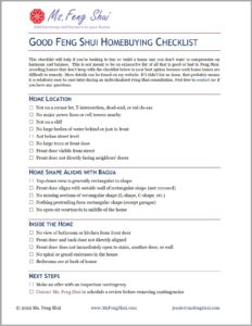 The following checklist will help if you’re looking to buy or build a home with good Feng Shui. However, this is not meant to be an exhaustive list of all that is good or bad in Feng Shui. Avoid homes that don’t keep with the checklist below. This is your best option because such home issues are difficult to remedy. Any issues missing from this list are likely relatively easy to cure later during an individualized Feng Shui consultation. Feel free to contact me if you have any questions.